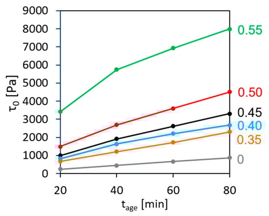 Less attention has been paid to the yield stress of suspensions. Chateau et al. [23] suggested a model for linking the yield stress of suspension consisting of monodisperse spherical particles and the yield stress of a non-reactive yield stress fluid . This is now known as the Chateau–Ovarlez–Trung model and reads as follows: . Mahaut et al. [24] proved the model to be equally valid for a cement-based suspension of glass beads. However, they emphasized that instead of the maximum volume fraction, a lower value should be taken in order to make the model and the experimental results closely comparable. They argued that direct contacts among aggregate particles are established before their volume fraction reaches . As soon as the particles are in direct contact, not only hydrodynamic but also frictional particle interactions occur, and the model becomes inapplicable. Relying upon the Roussel’s equation for structural build-up rate [25], the authors also stated that the same model is able to describe the ratio between the structural build-up rates of suspension and of cement paste : . It should be noted that the experimental data used as a basis for this conclusion were obtained for only short resting times of 2, 4 and 6 min after a strong stirring of the suspension.