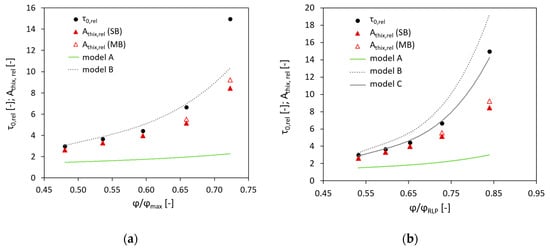 As presented in Figure 3, the Chateau–Ovarlez–Trung model, i.e., model A, could not adequately describe the experimental data neither in the case using the values of , as in the initial form of the equation (Equation (6)), nor in the case of implementing the values of instead of , as was done by Mahaut et al. [24], Lecompte et al. [26] and Perrot et al. [27].