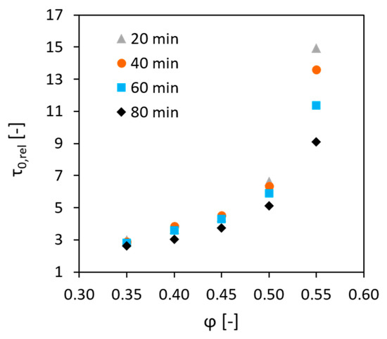 Furthermore, it should be explained why the modified equation of Mahaut et al. [24], , cannot provide a fit for the experimental result in this investigation. In their research, the authors relied upon the Roussel’s model and assumed that the effect of aggregates on the yield stress described by the expression is time-independent. This assumption seems logical, because and are not subjected to change after the concrete mixture is prepared. Mahaut’s model for the relative was proved to be valid for the short resting times and in the case when concrete was stirred before each SYS measurement. However, in the case of longer resting times and static conditions, as encountered in this research, the evolution of the relative SYS with the increasing volume fraction changed over time; see Figure 4.