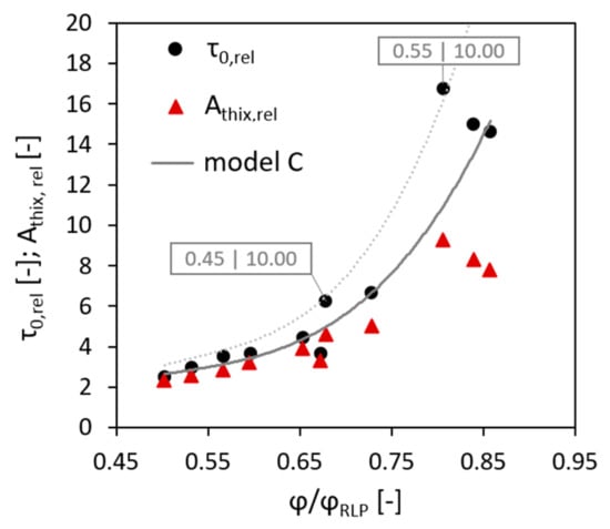 This deviation may be caused by considerably higher contents of fine sand in the respective compositions, which in turn resulted in the enhanced structuration of the concrete mixture. Thus, the behaviour as observed may count in favour of the possibility of physical-chemical interactions between cement paste and aggregate particles. In terms of the model, the higher volume fraction of fine particles can be taken into account by increasing the intrinsic viscosity parameter, which, according to [39], is higher in concentrated suspensions due to crowding. The dotted line presented in Figure 6 was obtained with = 5.6.