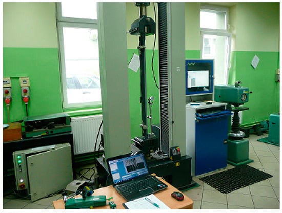 Another important factor was to select an appropriate initial tension of the sensor. The sensor’s initial tension was set precisely using right-and-left nuts with a fine thread. Apart from the dedicated optical fiber sensors, the system included a 2 kHz FBG-800 optical interrogator (Fibre Optic Sensing & Sensing Systems–FOS&S, Geel, Belgium), a recorder, special software, a multiplier and telecommunication fibers. An option was also possible with a wireless transfer of measurement results from the interrogator. The constructed optical fiber system intended for the measurement of strains arising in the tower legs was first tested in laboratory conditions. The tests consisted of setting the known force and strain values to a fragment of a tower leg cut-out together with the FBG sensor fixed on it. The fixing manner ensured that the cut-out response was identical with that of the actual tower leg. Considering the required spacing between the traverses of the strength-testing machine with Accuracy Class 0.5, the tests were performed in the Research and Supervisory Center of Underground Mining. The diagram of the tension and compression test rig is presented in Figure 2. Special grips were designed to fix the angle section in the jaws of the strength-testing machine and to enable the angle section buckling in relation to the axis characterized by the lowest value of the second moment of inertia. In the first stage, tests calibrating the measuring system were carried out in the following sequence: