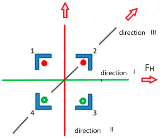 The strain testing results were composed of two parts. The first presented the results of measurements of strains arising in the tower legs under a simulated short-term lateral load of 500 N. The load was applied in the direction of the tower two axes (I, II) and along its diagonals (III). A diagram illustrating the loading is presented in Figure 5.