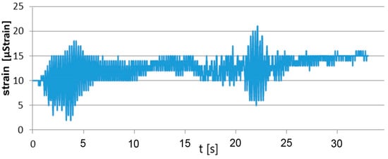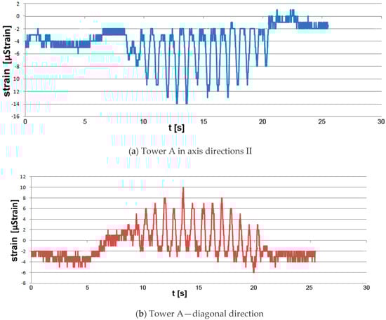The load applied to the tower in direction II resulted in compressive strains of −14 µstrain in legs 1 and 2. A tensile strain of 10 µstrain arose in the legs on the tower’s opposite side. The strain measurement results are presented in Figure 6a,b.