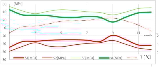 The changes in stresses were correlated with the changes in temperature (cf. Figure 8). Analyzing the temperature history during the observation, it can be noticed that stresses in the tower varied with changes in temperature. A drop in temperature involved a rise in the compressive stress value in the tower legs (to observation point 11). The rise in temperature that occurred in the post-winter period caused an increase in compressive stresses. In leg 1, stresses were increased by about 20 MPa, whereas in leg 2 the rise in compression was higher and totaled about 25 MPa. In summer, temperatures were higher and according to the observation results, stresses in leg 1 remained at the same level, whereas compressive stresses in leg 2 dropped to the value of about −50 MPa. The highest calculated value of compressive stress totaled 60 MPa. The stresses were compared to allowable stress values for this type of tower structure, which were defined precisely in [17]; they range from 150 to 250 MPa.