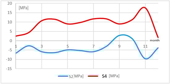 The second part of the testing concerned the observation of strains arising in selected legs of the tower over a period of one year. In the case of the legs of tower A, located on an island in a gravel mine area, strains rose in the winter period to 230–270 µstrain and then returned, in the case of leg 1, to the initial level of 150 µstrain. In the case of tower B, the course of the changes was similar, but the strain values did not return to the initial state and kept at the level of 230 µstrain. The tower leg was shortened, which meant that the stresses arising in the two legs were compressive. The strain values for the other two legs were similar but with the opposite sign, which meant that there was tension. By determining real strain values in the tower legs, it was possible to define the performance of the tower foundation. The tower rotation axis (direction II) at the tower base is marked in Figure 5. It passed between the legs subjected to compression and those subjected to tension. The hypothesis was also confirmed by the measurements of the tower apex deviation (cf. subsection on validation). Using physical relations (Hooke’s law), the values of stresses arising in the tower’s individual legs were determined. They are presented in Figure 8.