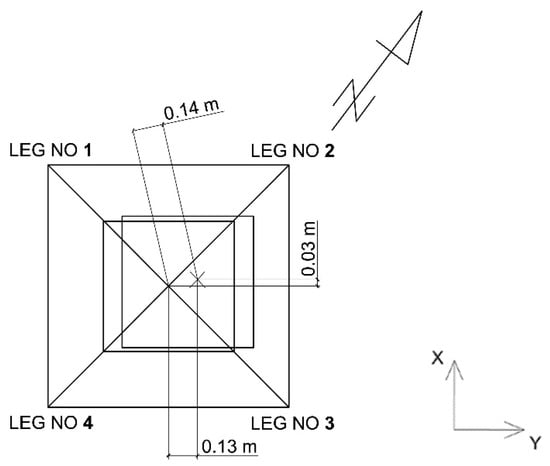 Validation by means of geodetic measurements was carried out on the tower apex deviation from the plumb line. The method of direct projection onto a leveling staff placed on the tower foundation was applied. A Leica TCR 407 tacheometer (LEICA, Wetzlar, Germany) and a measuring staff were used. The measurements revealed a tower axis deviation from the plumb line of 3 and 13.5 cm, respectively, in the direction parallel (component X) and perpendicular (component Y) to the course of the 110 kV high-voltage power transmission line (Figure 10).