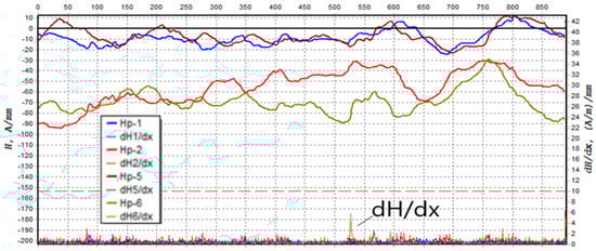 The tower legs were also tested using the residual magnetic field (RMF) method. The method is described in [28,29] and makes it possible to detect stress concentration zones in ferromagnetic elements, such as steel, used to build the tower legs. Stress concentration zones occur in areas where the magnetic indicator—the gradient of the normal and the tangential component along the measuring path—reaches a value exceeding 10 [(A/m)/mm.] No such areas were found in the case of the tower legs under consideration. Moreover, the method enables the detection of fractures and microcracks. In these particular areas, the residual magnetic field’s normal component becomes zero. Despite the long in-service time, the RMF testing did not detect any cracks in the tower leg. The distribution of the gradient of the tangential component magnetic field along the tower A leg is presented in Figure 11.