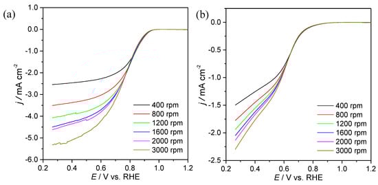 LSVs at different rotation speeds and quantitative Koutecky–Levich (KL) plots were obtained to gather more information about the ORR kinetics of these composites. Figure 7 shows the LSV in O2-saturated solution (after the subtraction of LSV in N2-saturated solution) while the corresponding KL plots can be observed in Figure 8. Both the composites prepared and Pt/C electrocatalyst show a first order ORR in relation to the concentration of oxygen dissolved with the KL plots presenting good linearity with lines showing similar slopes in the potential range scanned for each material. This suggests that the applied potential does not have a significant influence on the number of electrons transferred per oxygen molecule (nO2). In fact, the nO2 values estimated were almost constant with nO2 = 4.0, 3.6, 4.1 and 3.9 for Pt/C, S3N2–GF, Co/S3N2–GF and Mn/S3N2–GF, respectively. These values show that the ORR process at these electrocatalysts seems to proceed via a direct pathway (direct reduction of oxygen to water) involving four electrons. In the fuel cell industry, this is the preferred pathway, since it directly produces OH− ions as the final product without the formation of OOH− ions.
