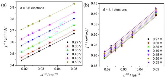 Koutecky–Levich (KL) plots obtained from the data in Figure 7 for S3N2–GF (a), Co/S3N2–GF (b), Mn/S3N2–GF (c) and commercial Pt/C (20wt%)-modified electrodes (d).