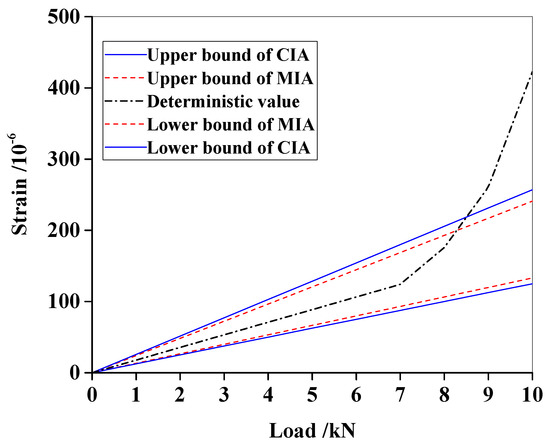 Table 1 shows that the intervals calculated by MIA are always smaller than those by CIA, proving that MIA can effectively avoid the phenomenon of interval overestimation. The deterministic strain calculated using Equation (13) intersects the intervals at the ninth load step, implying the occurrence of damage. For comparison, the strain envelopes are illustrated in Figure 2. It is observed that an inflection point appears at F = 7 kN, which accords with the deterministic damage assumption. However, in practice, such inflection could be caused by uncertainties or material defects, especially resulting in unstable strain measurements. This inflection is not reliable for damage detection. Therefore, the intersection between the measurement curve and the interval envelopes offers confirmation of damage occurrence. After the deterministic strain curve intersects the upper bound of MIA when F = 8.3 kN, it intersects the upper bound of CIA when F = 8.5 kN. Hence, MIA identifies the damage occurrence earlier than CIA, which could be an advantage in practice.