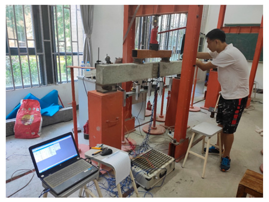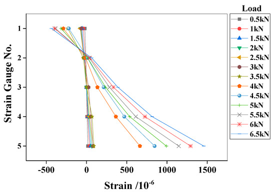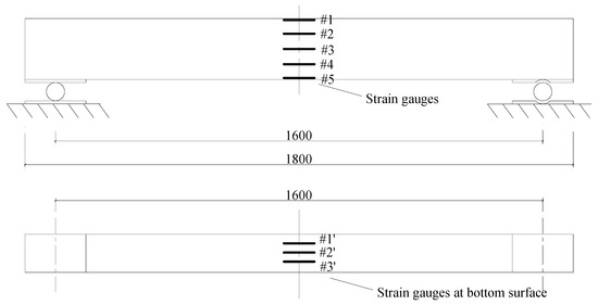 An experimental reinforced concrete beam (Figure 3) was further tested to validate the proposed method. The geometrical dimensions and material properties of the experimental beam were identical to those of the numerical beam. Eight strain gauges were mounted on the concrete surface at the mid-span of the beam, as shown in Figure 4. Five of them (#1–#5) were mainly used to check the plane cross-section assumption of the beam. The left three strain (#1’–#3’) gauges on the bottom surface were used to detect the initial cracking of concrete. The applied load was provided by a hydraulic jack using a loading scheme similar to that of the numerical beam (Figure 1). The strains were continuously recorded with a time interval of 3 s during the test. The beam stayed at its elastic state until the load F reached 6.5 kN, because the plane cross-section assumption was confirmed by the actual measurements shown in Figure 5.
