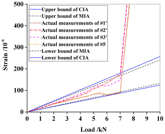 When the load reached around 7 kN, a visual main crack appeared at the beam bottom and grew rapidly with the increase of the load. The measured strains also went so fast that they suddenly intersected the interval envelopes, as shown in Figure 6. The main crack defined the cracking load. Therefore, the cracking load was determined to be 7 kN, which was close to the analytical solution of kN calculated using Equations (14), (15) and (16). Figure 6 also shows that MIA gives smaller interval predictions than CIA. For instance, the measured strain of #2’ successively intersects with the two envelopes, which means the actual strain exceeds the intervals considering the uncertainties. This observation proves that MIA can detect cracks earlier than CIA.