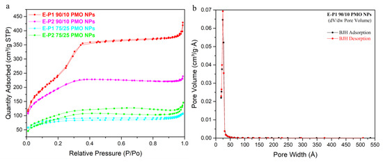 (a) N2-sorption isotherms of E-Pn PMO NPs; (b) BJH dV/dw Pore Volume of E-P1 90/10 PMO NPs.