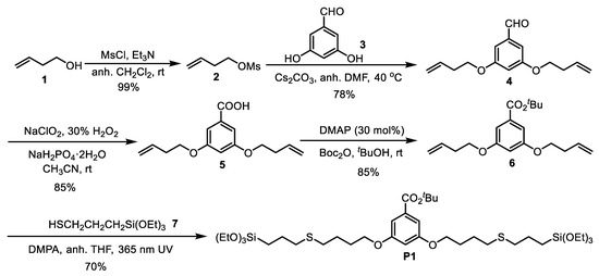 The synthesis of P1 is depicted in Scheme 1. We first converted commercial 3-buten-1-ol 1 into but-3-en-1-yl methanesulfonate 2 [40]. The dialkylation of commercial 3,5-dihydroxybenzaldehyde, 3, with the mesylate 2, in the presence of cesium carbonate in DMF at 40 °C, afforded 4 in 78% isolated yield after chromatographic purification [41]. The aldehyde 4 was oxidized to the carboxylic acid 5 by using NaClO2, 30% H2O2 and NaH2PO4 in aqueous acetonitrile at room temperature [42]. Subsequent treatment of 5 with Boc2O and 4-dimethylaminopyridine (DMAP) in tert-butanol at room temperature provided the ester 6 in 85% isolated yield [43]. Finally, the precursor P1 was obtained in 70% isolated yield by the versatile thiol-alkene click reaction between dialkene 6 and (3-mercaptopropyl)triethoxysilane 7 under irradiation at 365 nm using 2,2-dimethoxy-1,2-diphenylethanone (DMPA) as initiator [44].