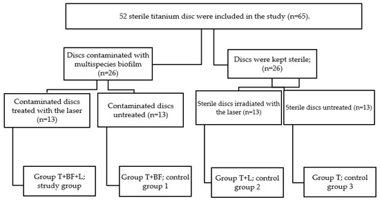 Study design, experimental and control groups in the study. T—titanium discs; BF—biofilm; L—laser treatment.