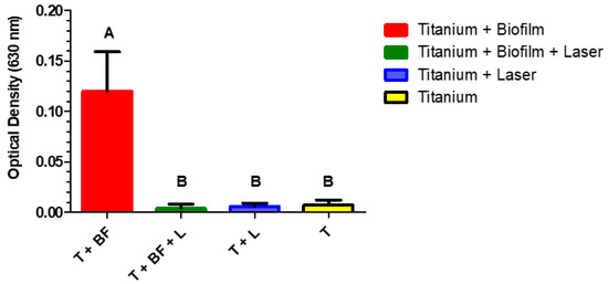 The amount of biofilm present on the discs in the different groups was measured through CV staining then expressed by means of the mean (± standard deviation) values of the OD630 nm, which reflects the crystal violet’s absorbance. For the T + BF + L group (study group), the OD630 nm was 0.042 ± 0.004, for the T+BF group (control group 1) 0.158 ± 0.039, for the T+L group (control group 2) 0.044 ± 0.004, and for the T group (control group 3) 0.053 ± 0.007. All values in all groups passed the normality tests. The OD630 nm value obtained for the study group T + BF + L was statistically significantly lower than for the T + BF group. In addition, the OD630 nm value obtained for the study group T + BF + L was similar to that obtained for the different control groups with sterile discs (Group T and Group T + L), as reflected by the absence of a difference between the study group and the control groups (the difference in values was not statistically significant). Therefore, laser treatment resulted in the complete elimination of the biofilms from the titanium discs, with statistically significantly lower OD630 nm values than for untreated, contaminated titanium surfaces and similar to those observed for sterile titanium surfaces (Figure 2). The difference was not statistically significant when the amounts of biofilm in the group T + BF + L was compared to the group T. Therefore, the null hypothesis was rejected.