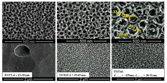 One of the surface modification paths in modern implantology, aiming at the enhancement of bioactivity and osteointegration, is the formation of TiO2 based coatings of defined structure, architecture, physicochemical, and mechanical properties, on the surface of titanium-based implants [,,]. The low cost and easy electrochemical production of titanium dioxide nanotubular coatings, possessing beneficial properties, i.e., high surface-area-to-volume ratio, strong oxidizing properties, chemical stability, non-toxicity, good mechanical properties, excellent corrosion resistance, and high biointegration activity, is an especially promising modification method [,,,,,,]. Due to the similar topography to natural bone, such modified surfaces promote direct contact with bone cells and the formation of apatite, which is the main component of bone tissue [,,]. Homogeneous nanotubular, but also nanoporous and nanosponge-like coatings, on the surface of a titanium/titanium alloy implant can be easily and quickly produced by controlled electrochemical anodization procedure, which has been meticulously optimized and described in our earlier reports [,,,,,,,,,,].