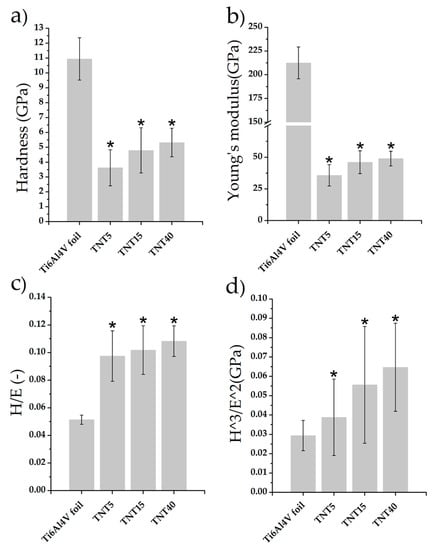 The nanomechanical properties: nanohardness (a), Young’s modulus (b), H/E ratio (c) and H3/E2 (d) of tested reference Ti6Al4V foil, TNT5, TNT15, and TNT40 specimens. Data are presented as the mean ± SD. Asterisks indicate significant differences to the reference specimen Ti6Al4V foil (* p < 0.05; ANOVA with Tukey post hoc correction).