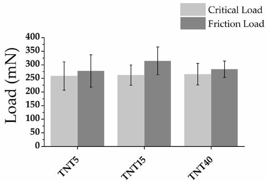 The nanoscratch-test results (critical load and friction load) of tested TNT5, TNT15, and TNT40 specimens.