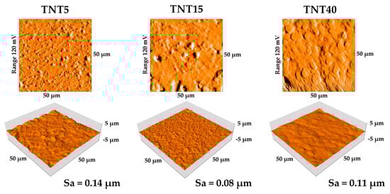 AFM topography of TNT5, TNT15, and TNT40 coatings with Sa parameter values.