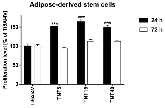 Proliferation level (measured after 24 and 72 h using MTT assays) of adipose-derived mesenchymal stem cells cultured on the TNT coatings compared with the reference Ti6Al4V alloy foils, which was served as 100%. Data are shown as mean ± SEM of four independent experiments. Asterisks indicate differences between the cells growing on the tested specimens in comparison with Ti6Al4V samples. (*** p < 0.001). The horizontal line shows the cell proliferation level cultured on the Ti6Al4V.