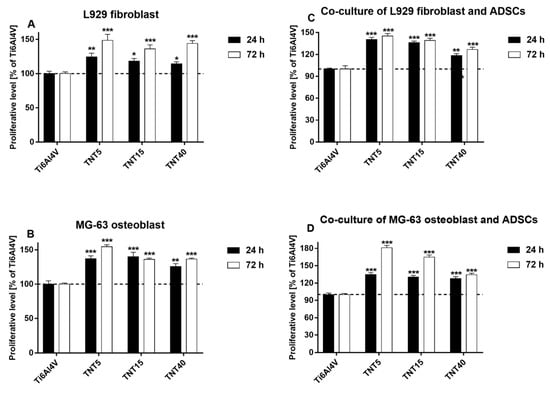 Proliferation level of L929 fibroblasts (A) and MG-63 osteoblasts (B) cultured on the surface of titania nanoporous (TNT5), nanotubular (TNT15) and nanosponge-like (TNT40) coatings compared with the reference Ti6Al4V samples. Figures (C,D) show proliferation level of the both cell lines co-cultured with adipose-derived mesenchymal stem cells (ADSCs). Cells were cultivated for 24 and 72 h, and cell viability was measured using MTT assay. The results are expressed as percentage of the cells cultivated (A-B) or co-cultured with ADSCs (C-D) on the reference Ti6Al4V samples (served as 100%). Data are shown as mean ± SEM of four independent experiments. (*** p < 0.001, ** p < 0.01, * p < 0.05, and were considered statistically significant compared to the cells gowing on the Ti6Al4V samples.