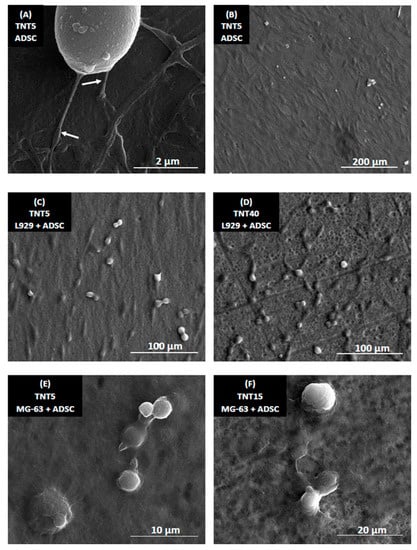 Figure 7 presents SEM micrographs of human mesenchymal stem cells (ADSCs; A,B), ADSC co-cultured with L929 fibroblasts (C,D) or ADSC co-cultured with MG-63 osteoblasts (E,F) on the TNT nanocoatings. Regarding the examination by SEM, it was observed that ADSCs formed filopodia (see white arrows in Figure 7A), which effectively attached the cells to the scaffolds surface. Importantly, ADSC had a typical, spindle shape and grew evenly on the entire surface of the nanocoatings (Figure 7B). ADSCs also produced the extracellular matrix when they were cultured on the scaffolds alone or co-cultured with MG-63 osteoblasts. L929 fibroblasts co-cultured with ADSCs also had an elongated shape and they were dividing (Figure 7C,D), indicating their good viability and vitality. The divisions of MG-63 osteoblasts co-cultivated with ADSCs were also observed (Figure 7E,F).