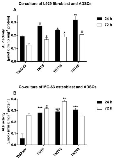 The osteogenic differentiation of ADSCs co-cultures was assessed on the basis of measurement ALP activity normalized to total protein content after 24 and 72 h. Figure 8 presents the comparison of ALP activity measured for fibroblasts or osteoblasts co-cultured with ADSCs on the TNT nanocoatings compared with Ti6Al4V references samples. The ALP activity of L929 cells co-cultured with ADSCs decreased over time (Figure 8A). However, the cells cultivated on TNT coatings still had higher ALP activity than those cultured on reference Ti6Al4V samples. What is more important is that titania nanoporous (TNT5) and nanotubular (TNT15) samples provoked a higher ALP activity over time in MG-63 osteoblasts co-cultured with ADSCs. Particularly, only TNT15 specimens induced the significantly higher ALP activity in osteoblasts co-cultured with ADSCs compared with control samples.