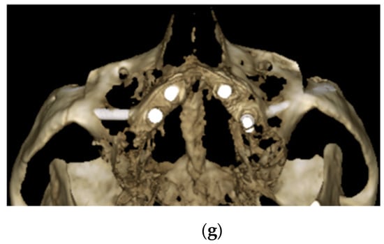 (a) Atrophic alveolar bone crest seen in a preoperative three-dimensional reconstruction CBCT image. (b) Atrophy of edentulous alveolar crest seen in an intraoral clinical image. (c) Placement of two posterior zygomatic implants (Branemark System Zygoma®, Nobel Biocare, Sweden). The coronal part of the zygomatic implant remains in a palatal position, and buccal fenestration is presented. (d) Buccal-centered image showing the buccal and palatal bone graft (KeraOs®, Keramat, Spain)). (e) Buccal-centered image showing overlap of the resorbable collagen membrane (Creos Xenoprotect®, Nobel Biocare) upon the bone graft. (f) Soft tissue healing at one month after implant placement. (g) Postoperative three-dimensional reconstruction CBCT image showing palatal and buccal bone regeneration around the implants at 6 months after surgery.