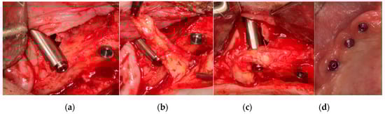(a) Buccal bone dehiscence present in a zygomatic implant with a smooth neck surface (IPX-Tilted System, Smooth, Galimplant S.L., Sarria, Galicia, Spain). More than half of the implant diameter outside the alveolar bone crest. (b) Pediculate subepithelial tissue palatal rotation graft. (c) Mesial and distal fixation of the soft tissue graft through suture. (d) Clinical image of soft tissue healing at 6 months after implant placement.