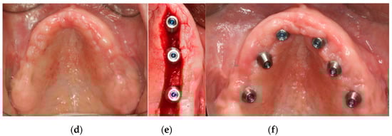 (a) Zygoma Quad system with buccal dehiscences seen in both quadrants (Smooth IPX-Tilted System®, Galimplant S.L, Sarria, Galicia, Spain). (b) A free connective soft tissue graft is collected from the palatal flap. (c) Soft tissue graft is repositioned with two surgical pins around the neck of the zygomatic implants. (d) Soft tissue healing at one month after the operation. (e) The gained soft tissue volume is seen in second stage surgery. (f) Soft tissue healing at three weeks after second stage surgery. The buccal mucosa is thick and keratinized.