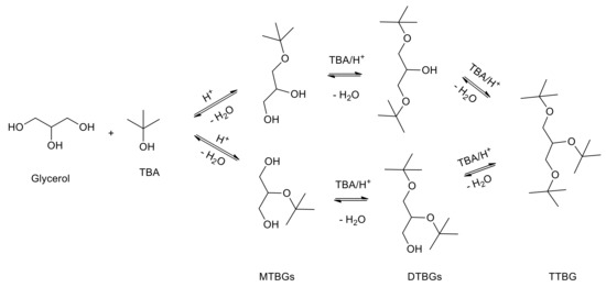 The etherification of glycerol with tert-butyl alcohol (TBA) to produce an oxygenated additive for fuel has become one of the best options to valorize glycerol in the biodiesel industry. The reaction, described in Figure 1, makes it possible to obtain mono-tert-butyl glycerol ethers (MTBGs), di-tert-butyl-glycerol ethers (DTBGs) and tri-tert-butyl glycerol ether (TTBG).