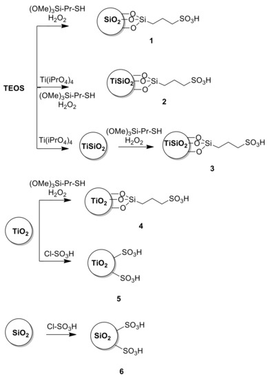 In particular, synthesized amorphous silica and titania were functionalized with a propylsulfonic group in samples 1 and 4 respectively. Sulfonic silica catalysts were doped with 10% w/w Ti, (2 and 3) in order to evaluate the effect of Ti on the properties of the material and, as consequence, on the catalytic performance. Moreover, the effect of alkyl chains on catalytic activity was considered both in the cases of silica and titania materials by the functionalization of the sulfonic group directly linked by a grafting procedure (samples 5 and 6, respectively). For the sake of comparison, the procedures for the synthesis of sulfonic catalysts are described in Figure 2.