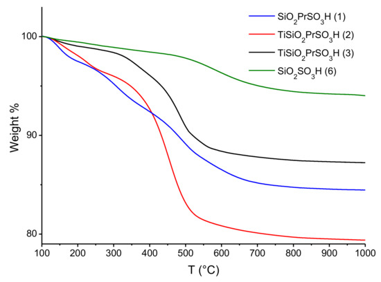 Different weight losses can be observed. The first one, under 200 °C, can be attributed to the removal of physisorbed water. The weight loss associated to the loss of (organo)sulfonic acid groups is in the range 300–600 °C. This weight loss is, therefore, indicative of the sulfonic groups present in the materials. The high surface area of silica-based materials promote the link with a higher number of sulfonic groups, above all during the one-pot procedure (15.5 and 20.6 wt.% in the case of propylsulfonic silica as it 1 or Ti doped 2, respectively). When the organic chain is grafted on the surface after the formation of titania-doped silica, the functionalization of catalyst 3 results in 12.8 wt.%. The direct grafting of the sulfonic groups onto the amorphous silica allowed us to obtain a yield of 6.0 wt.% in the solid 6. Concerning titania-based materials, in both cases, the loading of sulfonic groups was very low, which may be related to the low surface area (profiles not shown).