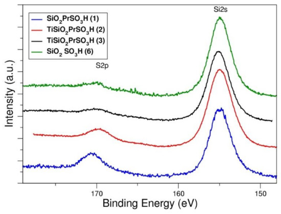 XPS spectra of propylsulfonic silica-based materials (1, 2, 3 and 6).