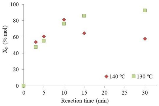 When the reaction was carried out at 130 °C, glycerol conversion increased with time up to 15 min, at which point a plateau was almost reached; in fact, the conversion continues slowly, increasing up to 93% at 30 min. A different profile was obtained when the reaction was carried out at 140 °C. In fact, glycerol conversion reached the maximum value (81%) after 10 min and then decreased to 58% at 30 min. This could be ascribed to the hydrolysis of the ether bonds formed during the reaction, and consequently, a conversion of the products into reactants. These results are in agreement with those of a study reported by Beatrice et al. [33] in which an increase of the reaction temperature promoted the thermal decomposition or recombination of reaction intermediates, changing the glycerol conversion and the selectivity. Furthermore, if the cause of the decrease in the glycerol conversion was the formation of IB or DIB, a stabilization in the conversion values would be obtained, but not a decrease thereof.