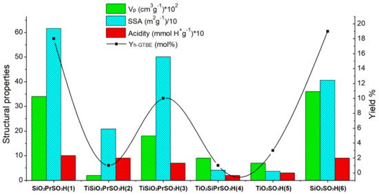 In general, a linear tendency is observed, indicating that acidity strongly influences the catalytic reaction, as previously observed by several authors [34,35,36]. However, an exception was observed for catalyst (2), i.e., Ti SiO2 PrSO3H. The one pot Ti SiO2 PrSO3H catalyst (2) exhibited strong acidity (0.9 mmol H+/g), so a high value of glycerol conversion and yield to h-GTBE was expected. Nevertheless, the lowest value of glycerol conversion (14%) and yield to h-GTBE (1%) was obtained with this catalyst.