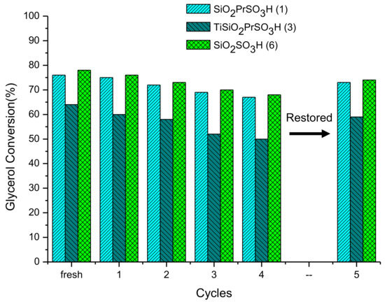 As shown, the glycerol conversion slightly decreased after each use for all the catalysts, being higher for Ti SiO2 PrSO3H (3).