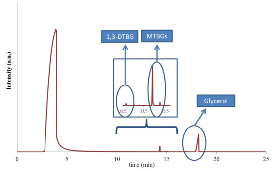 In particular, at the 4th cycle of the reaction, the glycerol conversion decreased by around 10% for catalysts 1 and 6 (from 76% to 67% and from 78% to 68%, respectively) and by 14% for catalyst 3 (from 64% to 50%). The leaching of the sulfonic groups in the catalysts was ruled out, since the value of sulfur content in the spent catalysts (after the 4th cycles) was almost the same as that of the fresh materials (Table 1). Therefore, this loss of activity could be associated with a poisoning of the catalyst from organic molecules that could have remained adsorbed on the solid after the reaction, as we previously observed in other catalytic systems [9]. To corroborate this, the spent catalysts (after the 4th cycle) were subjected to an extraction with ethanol under reflux for 3 h. Then, the solids were dried and the liquid fraction was distilled to eliminate the solvent ethanol. The organic fraction was then analyzed by GC, and glycerol and other products of the reaction (mainly MTBGs and DTBGs) were found (Figure 11).