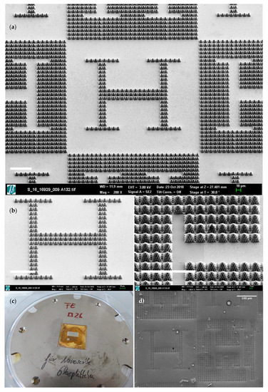 The DLW glass substrate was removed from the mold insert cavity by using a wet-chemical process and the DLW resist was stripped using a plasma treatment. Structure characterization by scanning electron microscopy (SEM, Carl Zeiss AG, Oberkochen, Germany), as quality control (see Figure 2 for details), completed the nickel mold or embossing tool fabrication.