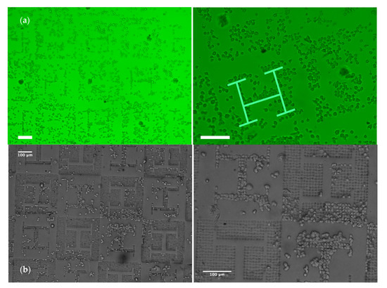 Once manufacturability is confirmed, cell culture experiments are carried out following the methods described in Section 2.4 and Section 2.5. As shown in the attached Supplementary Video (Video S1) and presented in the summary images from Figure 3 and Figure 4, Dictyostelium discoideum amoeboid cells, cultured upon the polyacrylamide substrates, interact with the surface showing an amoeboid motion with a speed of around 2–2.5 µm/min (Figure 4a), typically until they get trapped by the microwells generated upon the substrate, where they remain and rarely move away (Figure 4c). Figure 3a,b (and their zoomed-in views) shows that the surface pattern leads to non-uniform distributions of the cell population upon the surface and “H-like” aggregations can be perceived (as highlighted in pale green in the zoomed-in view of Figure 3a). In the regions with planar “H-like” patterns surrounded by microwells, trapped cells leaving an empty “vascular” region within can be also appreciated. In accordance with the width of vascular patterns, single-cell rows, duplets, triplets and clusters of cells can be appreciated.