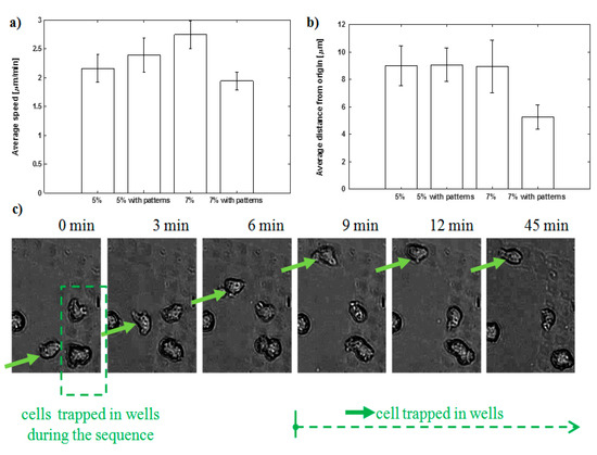 Influence of gel patterning and stiffness on amoeboid cell behavior: (a) Average cell speed; (b) average distance travelled by the cells from the origin to their final position during an experiment of 45 min; (c) representative sequence of images showing the movement and trapping of one cell in the wells of the gel.