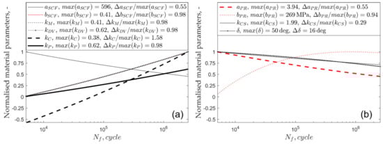 The variability of the normalised life-dependent material parameters applied in the multiaxial fatigue models is shown in Figure 4 and Figure 5. The maximum values of each material parameter along with their ranges, normalised by maximum value, are included in the legends of Figure 4 and Figure 5. The highest relative change in the material parameters was observed for the Crossland model for both tested materials.