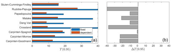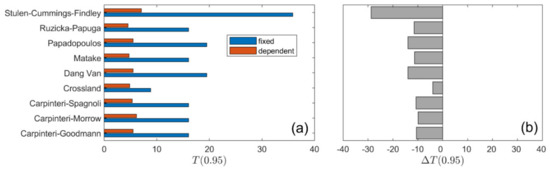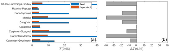 A summary of calculation results for all types of loading is presented in Figure 10, Figure 11, Figure 12 and Figure 13. The values of the coefficient for all analysed models using the fixed and life-dependent values of material parameters are presented in panel (a) of Figure 10, Figure 11, Figure 12 and Figure 13. Panel (b) of Figure 10, Figure 11, Figure 12 and Figure 13 present the change of (i.e., denotes an improvement of the fatigue life prediction due to the application of the life-dependent material parameters).