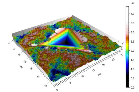 - Qasmi, M.; Delobelle, P. Influence of the average roughness Rms on the precision of the Young’s modulus and hardness determination using nanoindentation technique with a Berkovich indenter. Surf. Coat. Technol. 2006, 201, 1191–1199. [Google Scholar] [CrossRef]