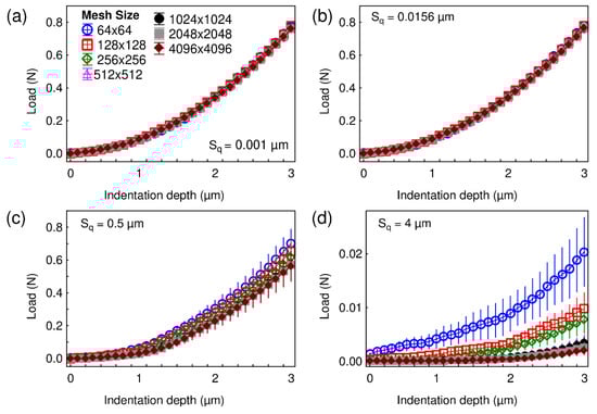 Before studying the influence of roughness on the determination of hardness, indentation curves were computed for different values of the root-mean-square roughness Sq using fixed wavelength and fractal dimension values. Figure 3 shows the loading parts of the indentation curves obtained with the semianalytical model for a maximum indentation depth equal to 3 µm. The wavelength and fractal dimension of the tested surfaces were, respectively, set to 32 µm and 2.5, while the root-mean-square roughness Sq was equal to (a) 0.001 µm, (b) 0.0156 µm, (c) 0.5 µm, and (d) 4 µm. Different mesh sizes were tested for each examined case. For Sq values of 0.001 µm and 0.0156 µm, it can be seen that all the loading curves are superimposed, whatever the tested mesh sizes, and very low standard deviations are observed. For Sq equal to or larger than 0.5 µm, there is a change of trend: the loading curves are superimposed for small indentation depths, and then the curves obtained with lower mesh sizes tend to show larger loads than the curves computed with larger mesh sizes, for a given indentation depth. For Sq equal to 0.5 µm, the standard deviations of all the curves overlap. On the contrary, when Sq is equal to 4 µm, the curves obtained with mesh dimensions equal to 64 × 64, 128 × 128, and 256 × 256 show different trends than the ones obtained with mesh sizes equal to or larger than 512 × 512. Moreover, these curves have very low load values compared to the other tested Sq values for similar indentation depths. It seems that the surface roughness is too large compared to the indentation depth. The surface asperities only began to flatten, thus giving low load values. To underline the importance of the scale and as the examined contact case has selfsimilar geometry, dimensionless results were computed for the following figures, i.e., the results are expressed using the ratio Sq/hmax, where hmax is the maximum indentation depth.
