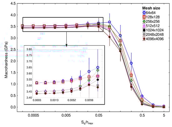 Macrohardness as a function of the ratio Sq/hmax, which is the root-mean-square roughness divided by the maximum indentation depth, computed with different mesh sizes. The wavelength and fractal dimension of the tested surfaces are, respectively, set to 32 µm and 2.5.