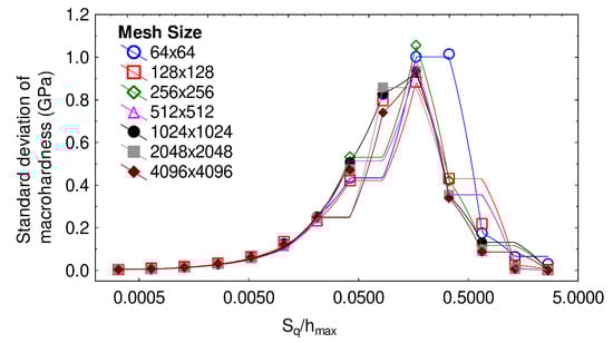 In order to confirm these results, the variation of the standard deviation of the macrohardness was examined as a function of the ratio Sq/hmax for different mesh sizes in Figure 5, using the same wavelength and fractal dimension as in Figure 4. For a ratio Sq/hmax larger than 0.04, the macrohardness standard deviation becomes non-negligible as it is larger than 0.5 GPa. The same transition zone, as in Figure 4, is thus identified. The macrohardness standard deviation rises to a maximum approximately equal to 1 GPa for a ratio Sq/hmax around 0.2, whatever the mesh size. The lower standard deviations of macrohardness observed for ratios greater than 0.2 are correlated with the decrease of macrohardness observed in the previous graph. Hereafter, the mesh size is fixed and is equal to 256 × 256 as it gives representative results and enables quick computation to be performed.