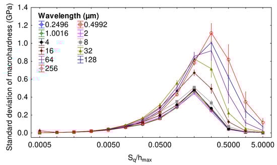 Standard deviation of macrohardness as a function of the ratio Sq/hmax for different values of wavelengths. The mesh size and fractal dimension of the tested surfaces are, respectively, set to 256 × 256 and 2.5.