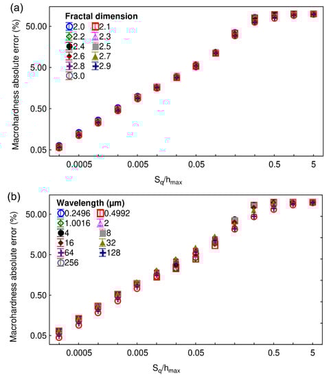 The macrohardness absolute error as a function of Sq is computed using (a) different fractal dimensions and a fixed wavelength equal to 32 µm and (b) different wavelengths with a fractal dimension set to 2.5. The mesh size is 256 × 256.